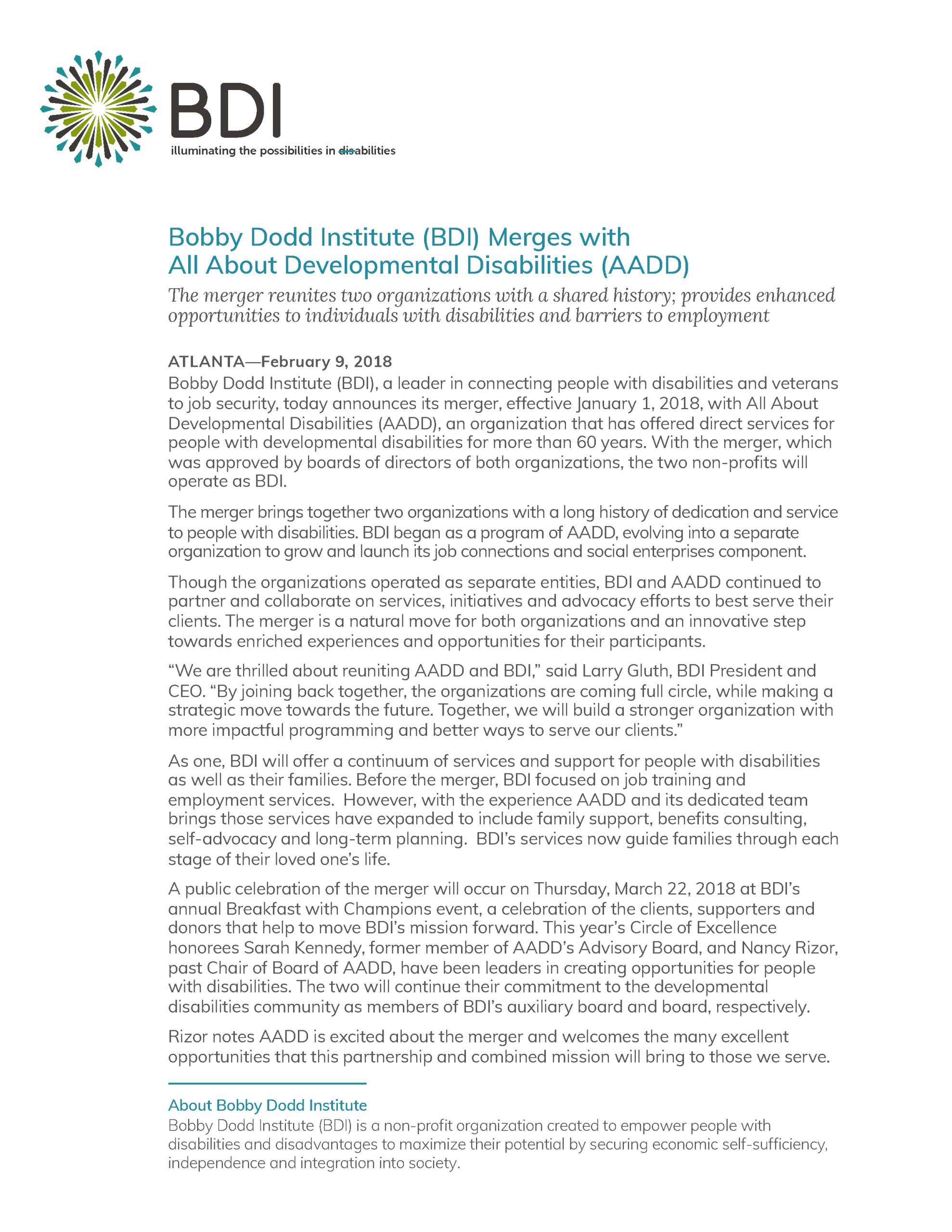 BDI began as a program at All About Developmental Disabilities (AADD) in the 1960’s. After decades apart, the two organizations officially reunited in January 2018 to reconnect their shared mission and better serve those with disabilities.